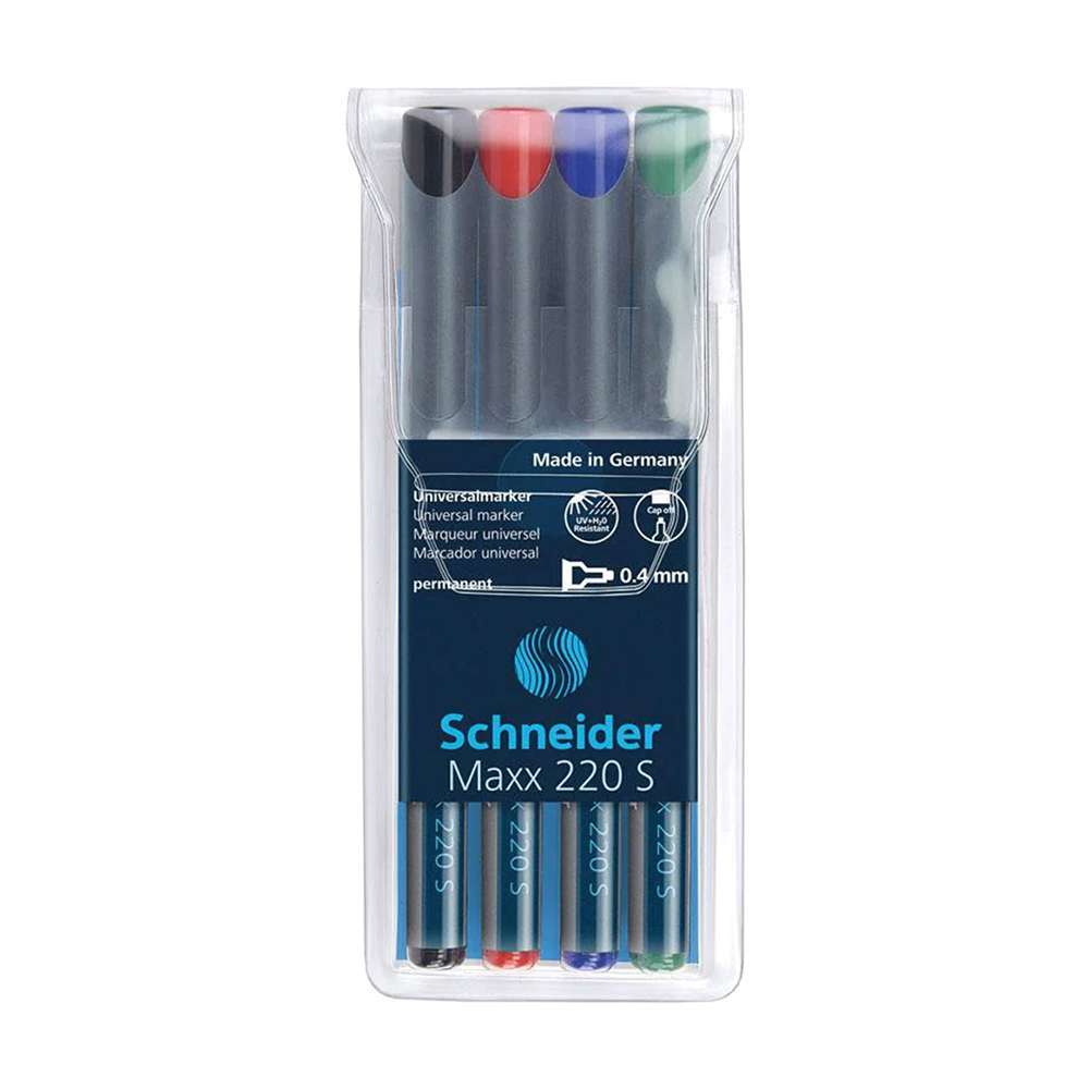 Schneider provides assorted super-fine permanent markers for office, school, and home. Model SCH0269112494 (Maxx 220 S 0.4, 4-color) supports precise, color-coded notes on film and smooth plastics. Ideal for multi-subject indexing, compact charts, and shared sets.