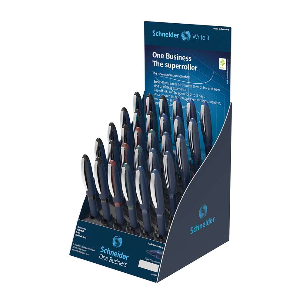 Schneider’s SCH0966 counter display stocks professional 0.6 mm One Business pens for reception areas, classrooms, and team hubs. Super-Flow ink, cap-off tolerance, and a comfortable grip make them reliable for signatures and long notes, with the stand keeping colors visible and ready.