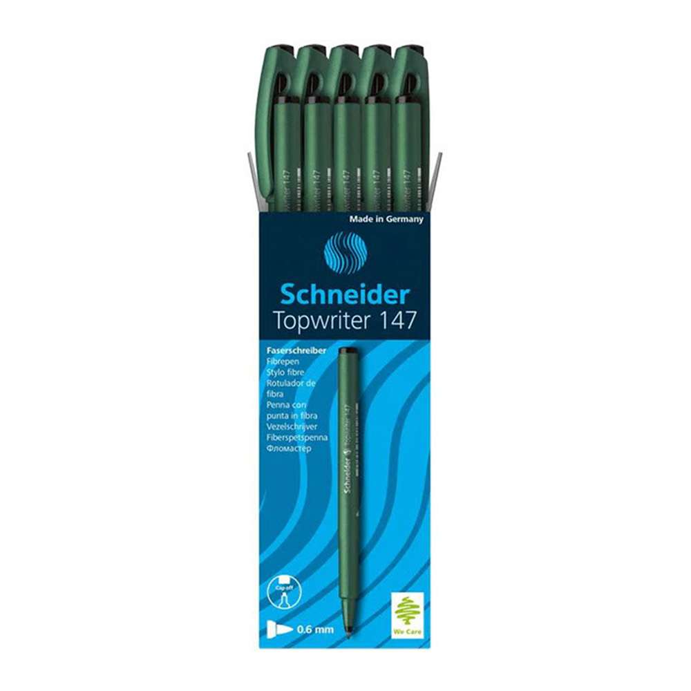 Schneider provides reliable fibre pens for office, school, and home. Model SCH02741471 (Topwriter 147, black) uses a hard-fibre 0.6 mm tip for neat, steady lines. Cap-off ink resists drying, supporting notes, outlines, and quick labeling with consistent performance and easy control on common papers.
