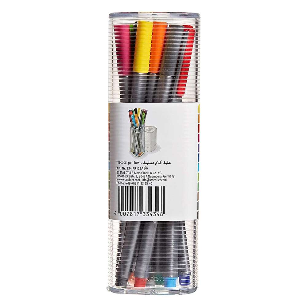 Staedtler Triplus fineliners (Model ST-334-PR12EA) deliver 12 vibrant, water-based colors in a stand-up desktop tub. The ergonomic triangular barrel improves comfort, while the metal-clad tip draws precise lines. DRY SAFE ink resists drying when uncapped, keeping classrooms and studios productive.