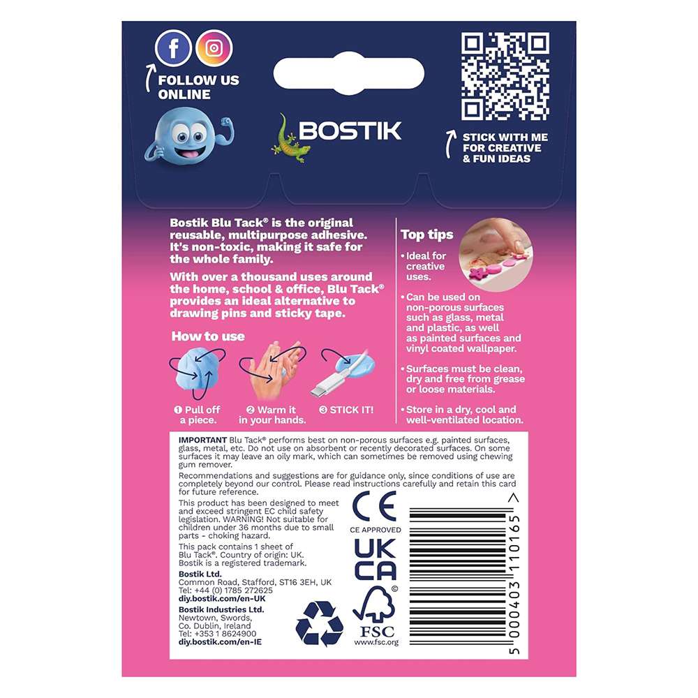 Bostik Blu Tack - Pink provides a multi-purpose adhesive solution that is removable, reusable, and perfect for temporary bonding. Model BK-30605530-0165 offers reliable adhesion without causing damage, making it ideal for use in the office, school, or at home for light-duty tasks such as mounting, crafting, or temporary fixes.