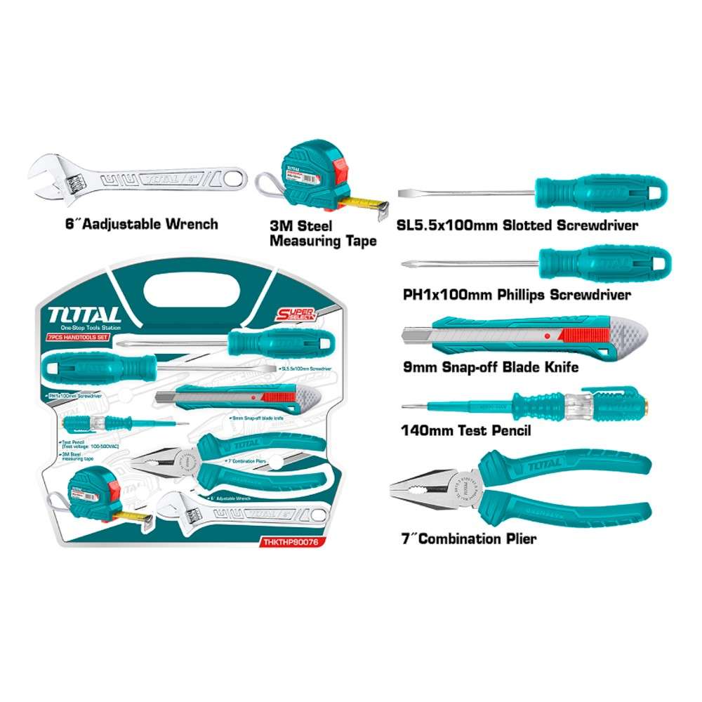 • 7-Piece Handtools Set for DIY enthusiasts.1. The Total THKTHP90076 Handtools Set is a must-have for any DIY enthusiast. This 7-piece set is designed to cater to all your basic tool needs, making it perfect for beginners and experts alike. The tools in the set are made of high-quality materials to ensure long-lasting durability and excellent performance. From hammering in nails to tightening screws, this set has got you covered. With each tool designed to be compact and versatile, it is perfect for everyday tasks around the house or for small repairs. Don't let the size of this set fool you, these tools pack a punch and will surely exceed your expectations.