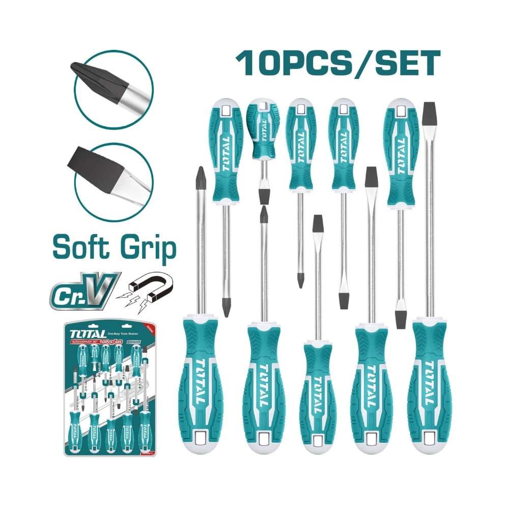 • Complete screwdriver set for all your needs.1. The Total THT250610 Screwdriver Set includes 10 essential screwdrivers for all your household and DIY projects. These tools are made from heat-treated steel, ensuring durability and long-lasting use.