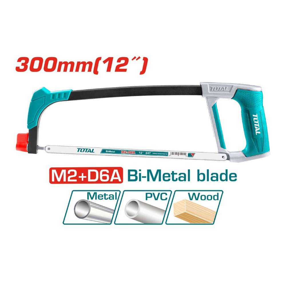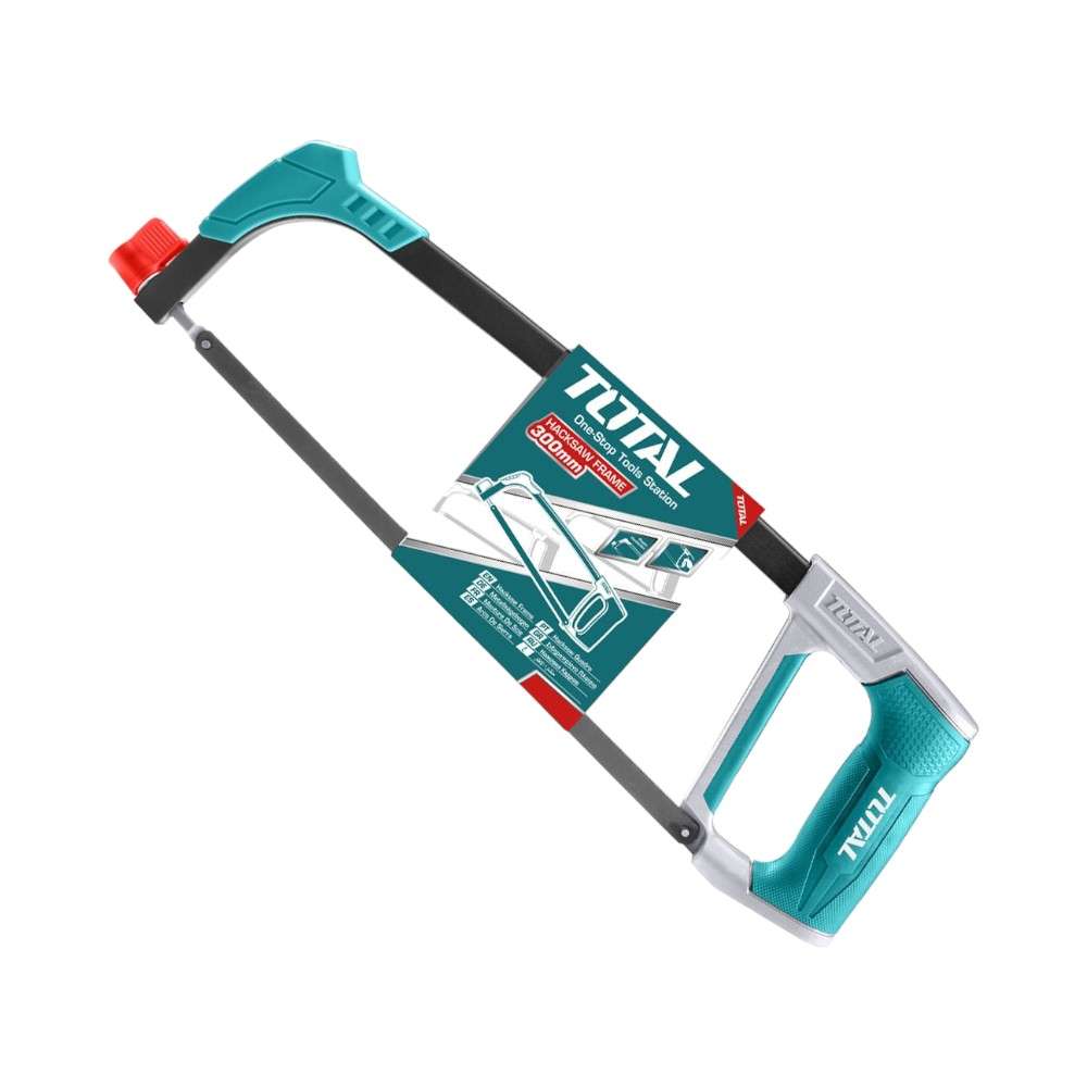 • Heavy duty 12" hacksaw frame by Total THT541026.1. The Total THT541026 12 Inch Heavy Duty Hacksaw Frame is the perfect tool for any cutting job, whether it be for DIY projects or professional use. This sturdy frame is designed to provide maximum stability and precision, ensuring a clean and accurate cut every time. Its ergonomic design allows for a comfortable and firm grip, reducing fatigue and increasing control. It's also designed for easy blade replacement, making it a convenient and efficient tool to have in your arsenal. With its heavy duty construction, this hacksaw frame is built to last and withstand even the toughest materials.