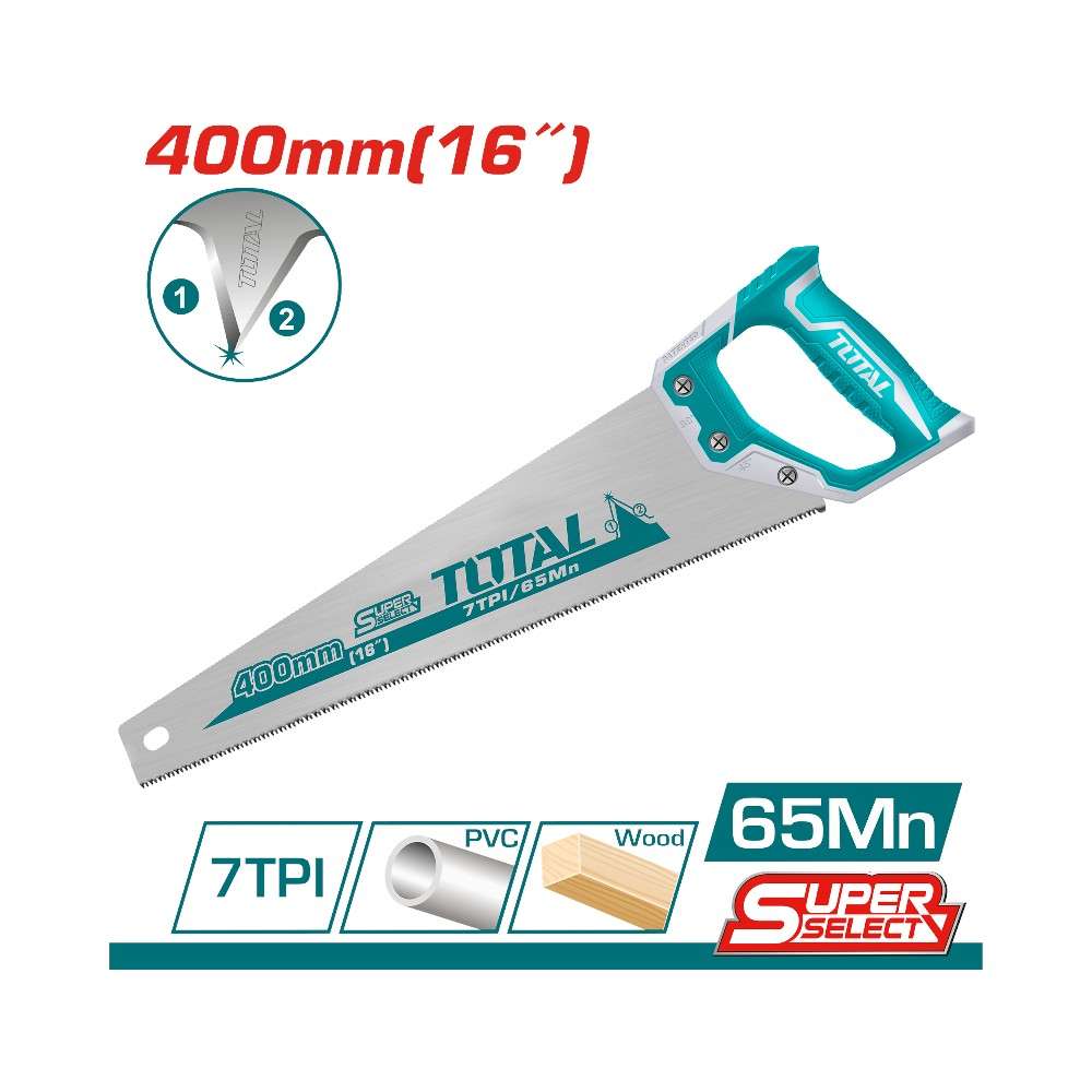 • Durable 16 inch hand saw for precise cutting.1. The THT55400 16 Inch Hand Saw from Total is a top-quality tool that is specifically designed for creating precise cuts. With its strong and durable construction, this hand saw is capable of tackling even the toughest of materials with ease. The 16 inch length makes it the perfect size for all your cutting needs, while the ergonomic handle ensures a comfortable grip and maximum control. Equipped with sharp teeth, this hand saw delivers efficient and smooth cutting every time. Ideal for carpentry, woodwork, and DIY projects, the THT55400 is a must-have tool for every handyman.