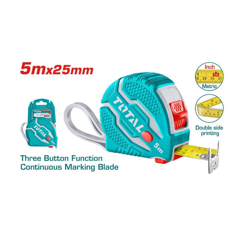 • Heavy-duty steel measuring tape with 5M length.1. The Total TMT126052 5M X 25MM Steel Measuring Tape is a must-have tool for any handyman or DIY enthusiast. Made from heavy-duty steel, it is built to withstand daily use and provide accurate measurements. The tape has a length of 5M and is 25MM wide, making it compact and easy to carry around. The material used is durable and can handle both indoor and outdoor use. With its user-friendly design, this measuring tape ensures precise measurements every time. Whether you are working on a construction project, doing home renovations, or simply need to measure something, this steel measuring tape will be your go-to tool.