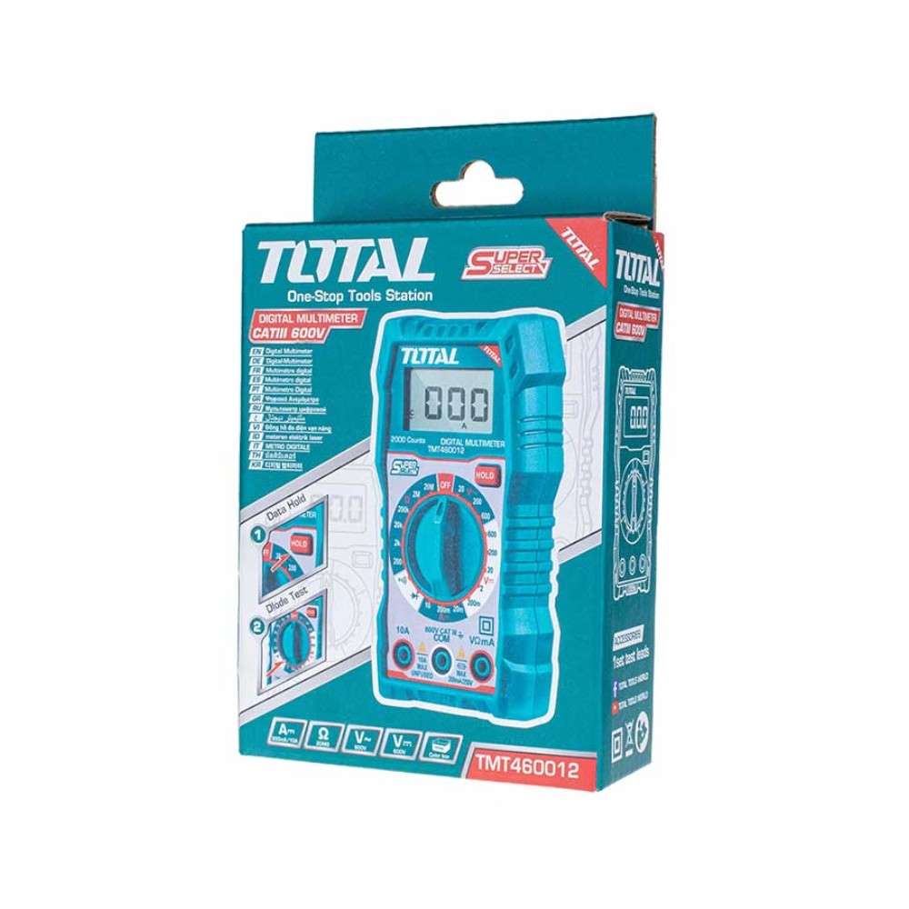 • Versatile digital multimeter for accurate measurements.1. The Total TMT460012 Digital Multimeter is a versatile and highly useful tool for any electrician or DIY enthusiast. With its easy-to-read LCD display and comprehensive built-in functions, this multimeter allows for quick and accurate measurements of voltage, current, and resistance. Its sturdy design ensures reliable performance in any environment, whether it's a busy job site or your own workshop at home. This must-have tool will save you time and effort in troubleshooting electrical issues and is an essential addition to any toolkit.