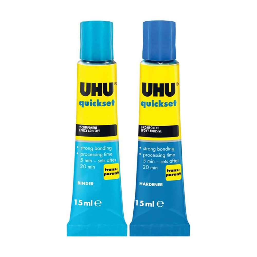 UHU delivers a two-component epoxy for fast, strong repairs. The focus is on 5-minute handling, high strength, and clear curing, helping users join metals, ceramics, wood, and plastics. Model UH40608 includes separate tubes for accurate mixing.