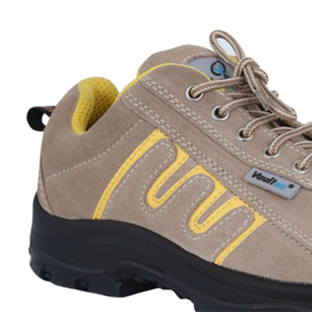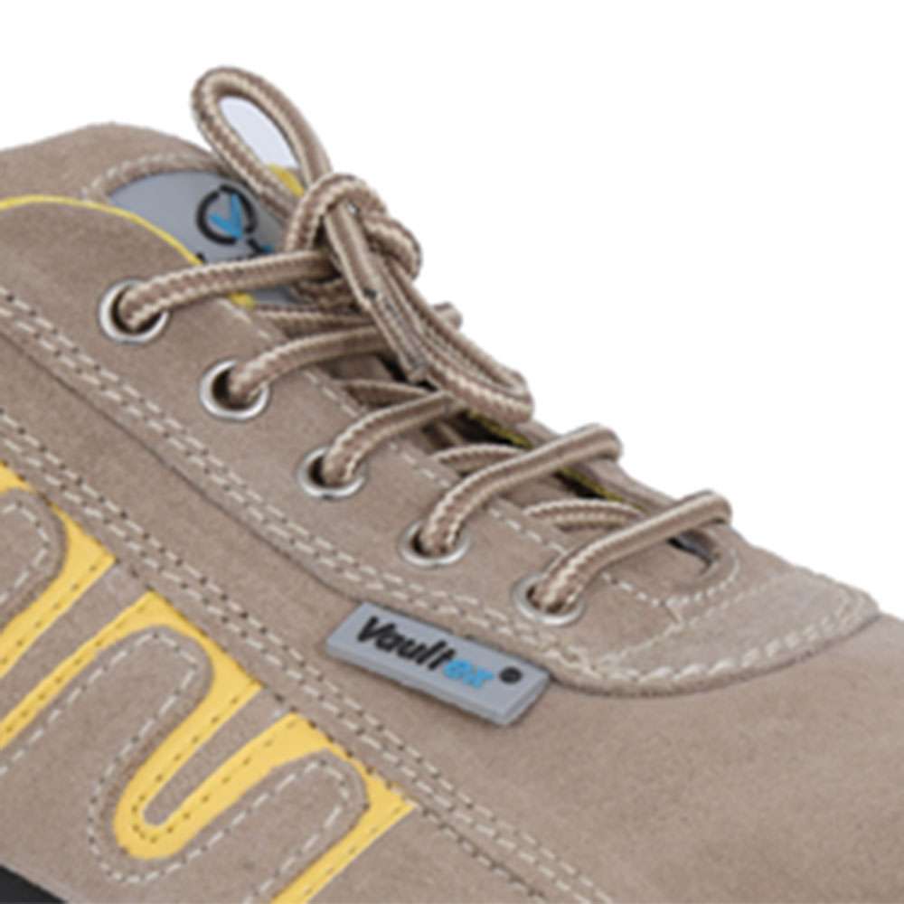 • Keep your feet safe with Vaultex SAQ shoes.1. The Vaultex SAQ shoes are a perfect combination of style and safety. The brand is known for its high-quality products and these shoes are no exception. Made with Suede Leather material, these shoes have a trendy Beige Yellow color that is sure to make you stand out. They also feature a Steel Toe Cap to protect your toes and the Steel Toe Cap material makes them sturdy and durable. These shoes have an SBP safety standard rating, ensuring that they provide maximum protection. With a Lace Up closure and Oil-Resistant, Energy Absorbing Heels, these shoes also have a Padded Insole for added comfort.